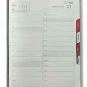 This 2026 Executive Diary includes Month-in-View calendars and a One-Day-Per-Page layout, each ruled with subtle time columns to help structure your daily tasks. Monthly color-coded tabs make it easy to jump to any month, while mini month calendars and week numbers keep your schedule clear and precise.